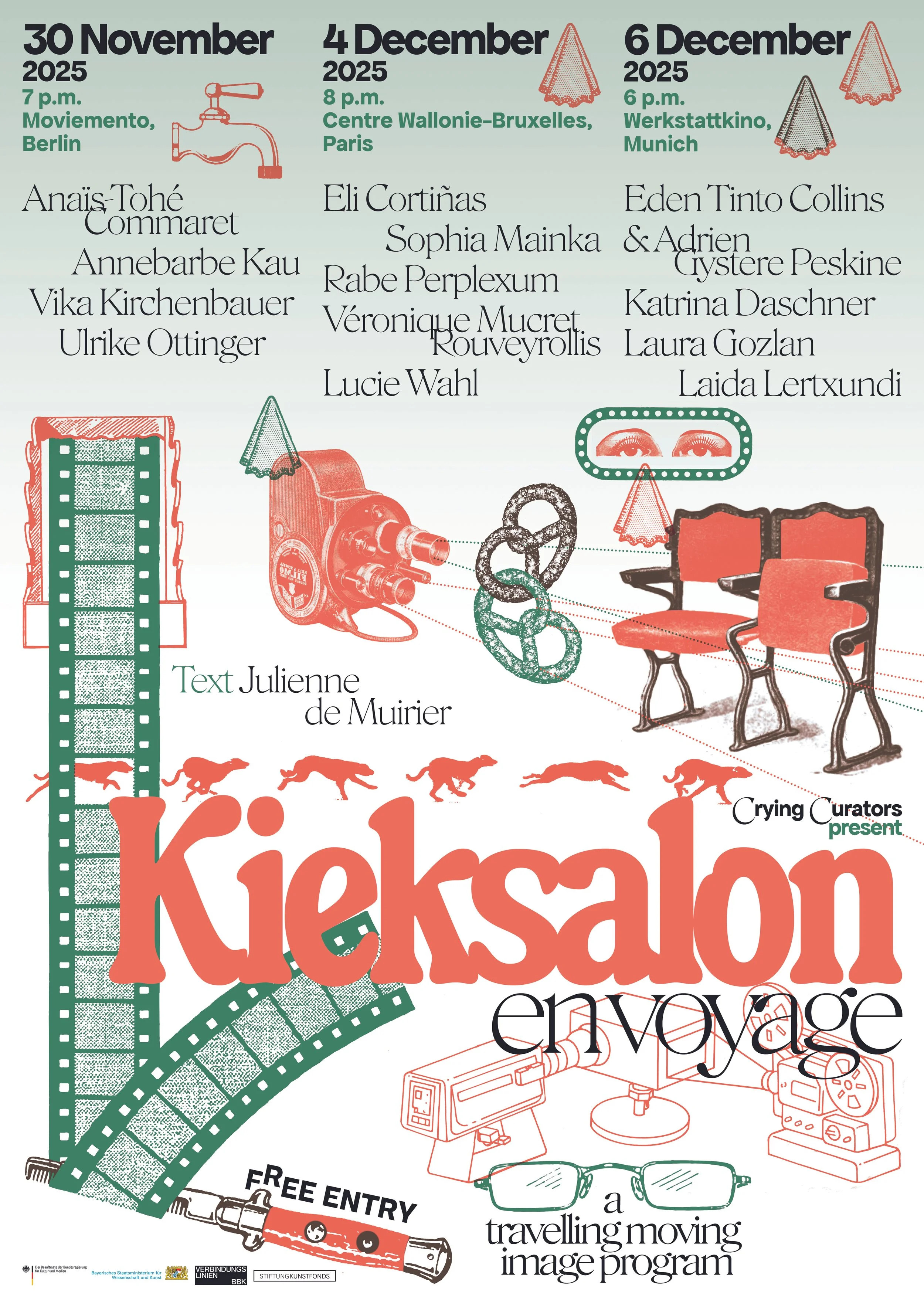 Kieksalon en voyage ist ein reisendes Programm des experimentellen Kinos, entwickelt vom Künstlerinnen-Kuratorinnen-Duo Crying Curators. In drei Kinos präsentieren wir jeweils ein eigenes Programm mit insgesamt vierzehn FLINTA*-Positionen – darunter junge und bereits etablierte Stimmen sowie archivalische Wiederentdeckungen.