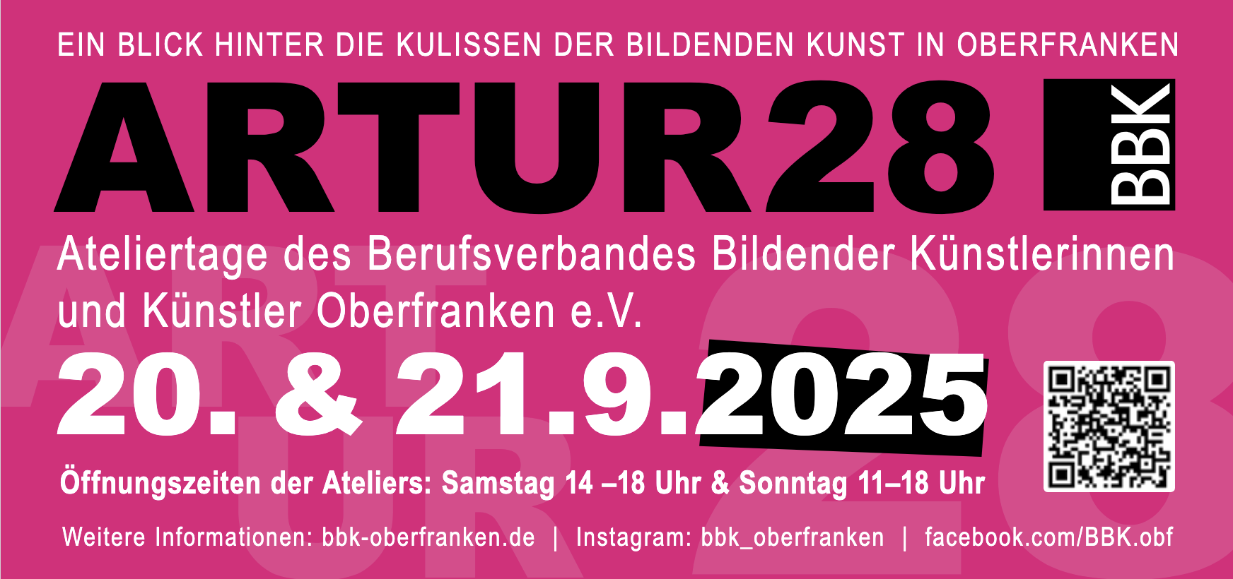 35 professionelle Kunstschaffende des Berufsverbands Bildender Künstlerinnen und Künstler Oberfranken e.V. (BBK) laden am Samstag von 14 bis 18 Uhr und am Sonntag von 11 bis 18 Uhr in ihre Ateliers oder Werkstätten ein, um einem interessierten Publikum zu zeigen, wo und wie die Kunst entsteht. In Bamberg und ihrem Landkreis sind es alleine 17 Ateliers, die man während der ARTUR28 besuchen kann, in Bayreuth sind es vier, in Kronach zwei und eines in Kulmbach bzw. Eggolsheim. Etliche Ateliers in Erlangen, Untermerzbach, Königsberg und Hofheim vor der Rhön kommen mit hinzu.